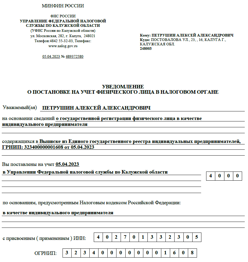 для корреспонденции 248003, г.Калуга, ул.Постовалова, 23-16